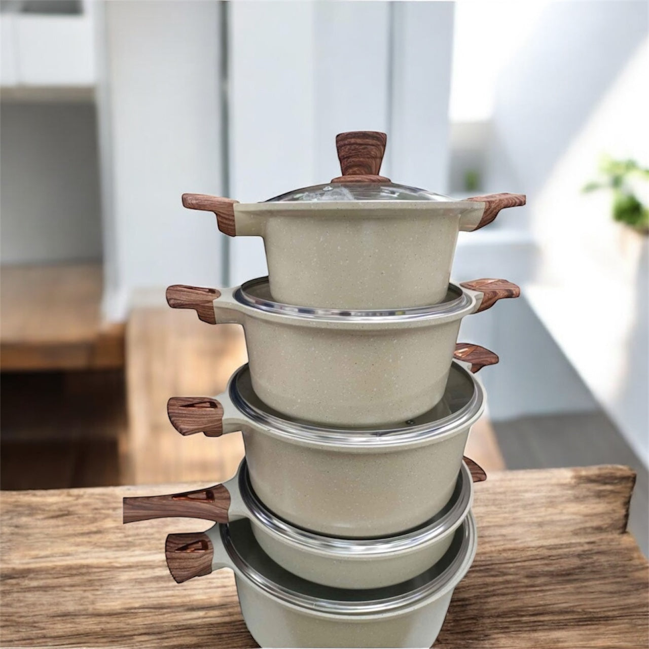 - Handles and Knobs: The handles on the pots and the knobs on the tempered glass lids have a wood-look finish, which provides a comfortable, cool-touch grip during cooking.